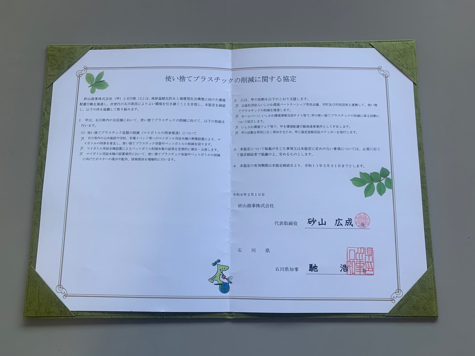 令和8年2月10日に弊社は、石川県と「使い捨てプラスチックごみ削減に関する協定」を締結いたしました。
